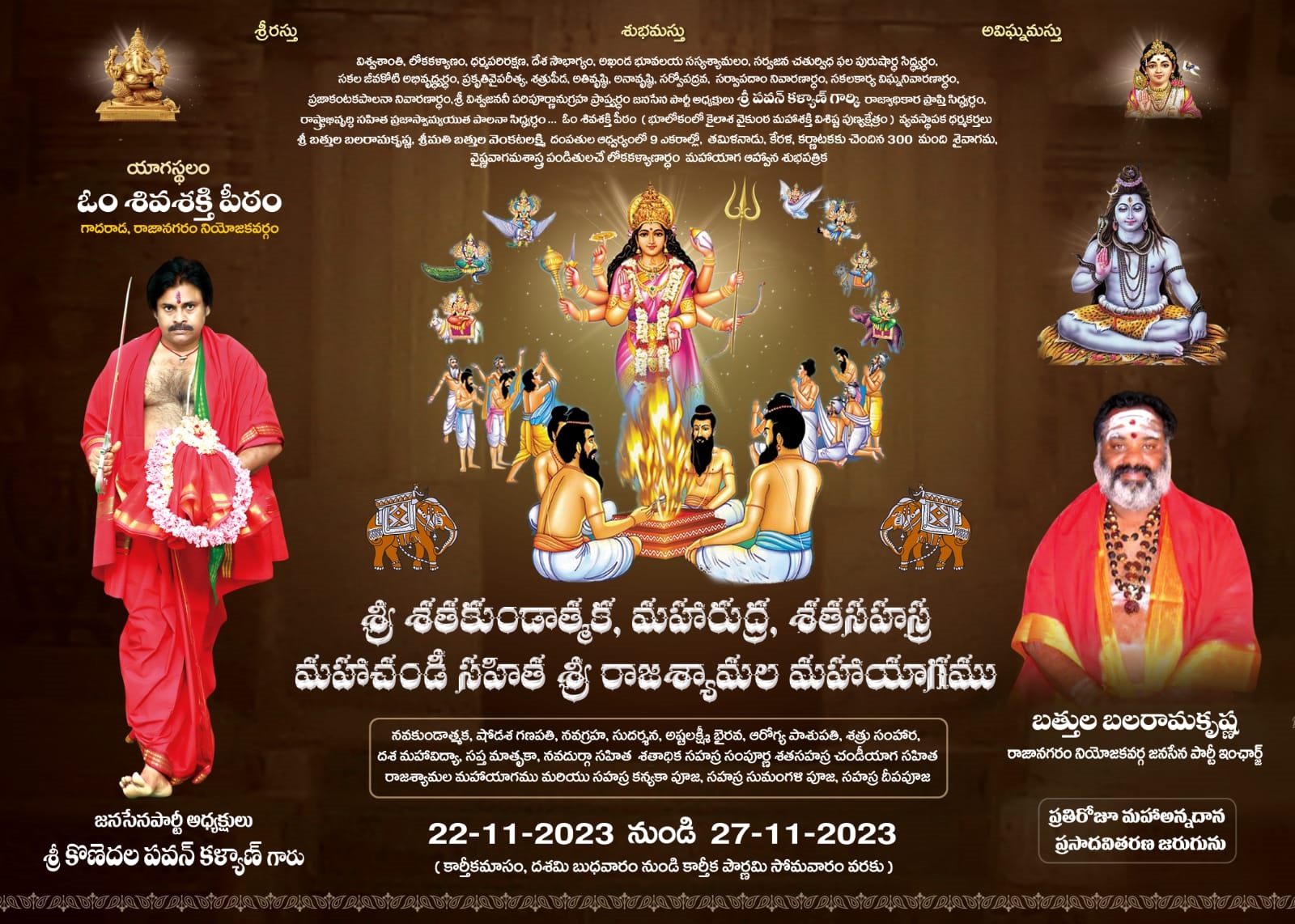 రాజానగరం నియోజకవర్గ జనసేన పార్టీ ఇంఛార్జ్ శ్రీ బత్తుల బలరామకృష్ణ గారు, వారి సతీమణి శ్రీమతి బత్తుల వెంకటలక్ష్మీ గారు దంపతుల ఆధ్వర్యంలో... విశ్వశాంతి, లోక కళ్యాణం, ధర్మ పరిరక్షణ కొరకు, అతివృష్టి, అనావృష్టి, ప్రజాకంటక పాలన నివారణ కొరకు జనసేన పార్టీ అధ్యక్షులు శ్రీ పవన్ కళ్యాణ్ గారికి విశ్వజనని పరిపూర్ణానుగ్రహ ప్రాప్త్యర్ధం, రాజ్యాధికార ప్రాప్తి సిద్ధ్యర్థo, రాష్ట్రాభివ్రుద్ది సహిత ప్రజాస్వామ్యయుత పాలనా సిద్ధ్యర్థo అఖండ భక్తి, జ్ఞానాలతో శ్రీ శతకుండాత్మక, మహారుద్ర, శతసహస్ర మహాచండీ సహిత శ్రీరాజ శ్యామలయాగం కార్తీక మాసం పర్వదినాలను పురస్కరించుకుని ది. 22-11-2023 బుధవారం నుండి ది. 27-11-2023 కార్తీక పౌర్ణమి సోమవారం వరకూ, ఓం శివశక్తి పీఠం, గాదరాడ గ్రామం, కోరుకొండ మండలం, రాజానగరం నియోజకవర్గo, తూర్పు గోదావరిజిల్లాలో చేయ సంకల్పించడమైనది.