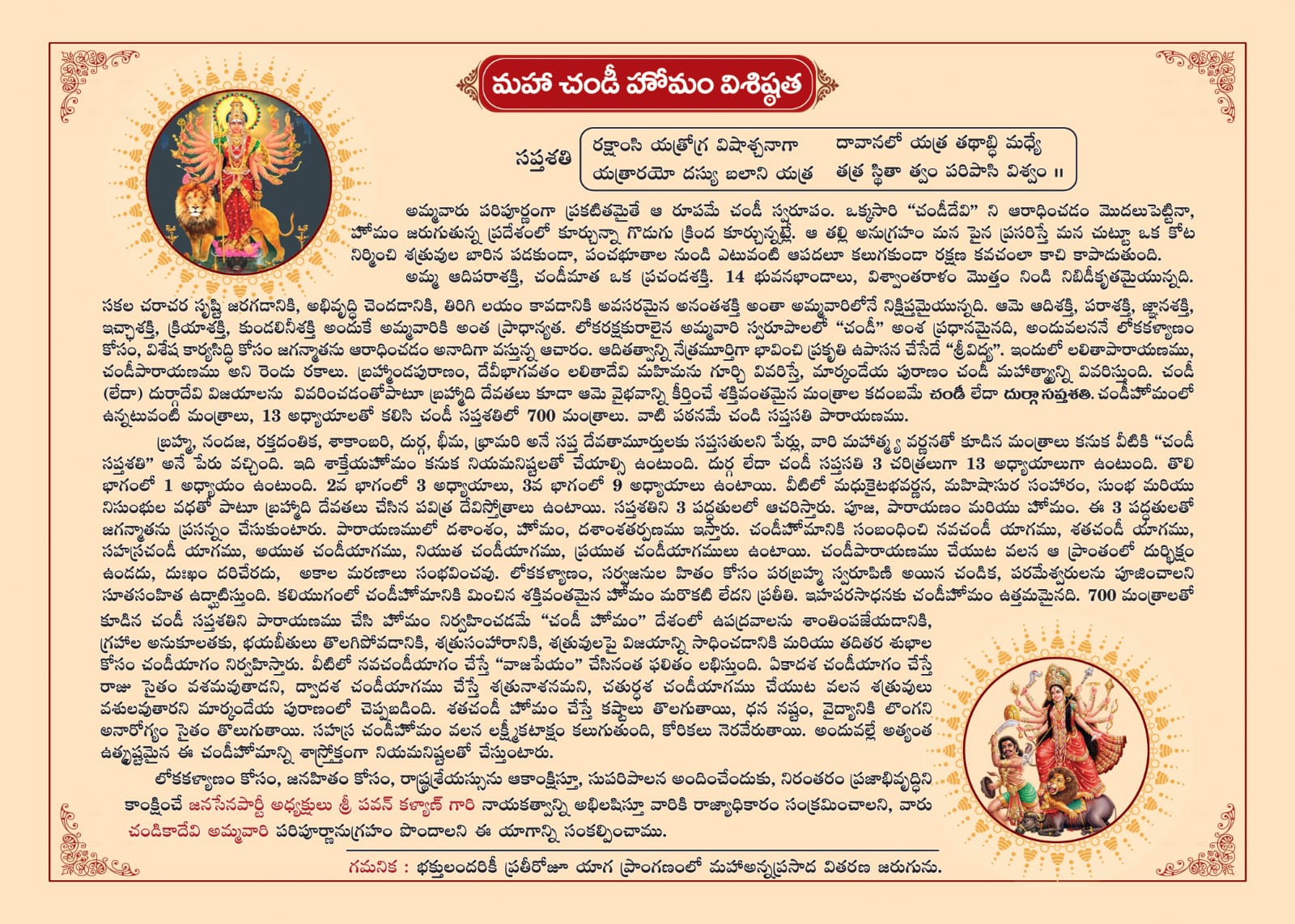 కావున అశేష ప్రజానీకం, జనసేన పార్టీ నాయకులు, కార్యకర్తలు, వీరమహిళలు యువతతో సహితం యావన్మందీ పాల్గొని అమ్మవారి కరుణా కటాక్షాలకు పాత్రులు కాగలరని కోరుచున్నాము