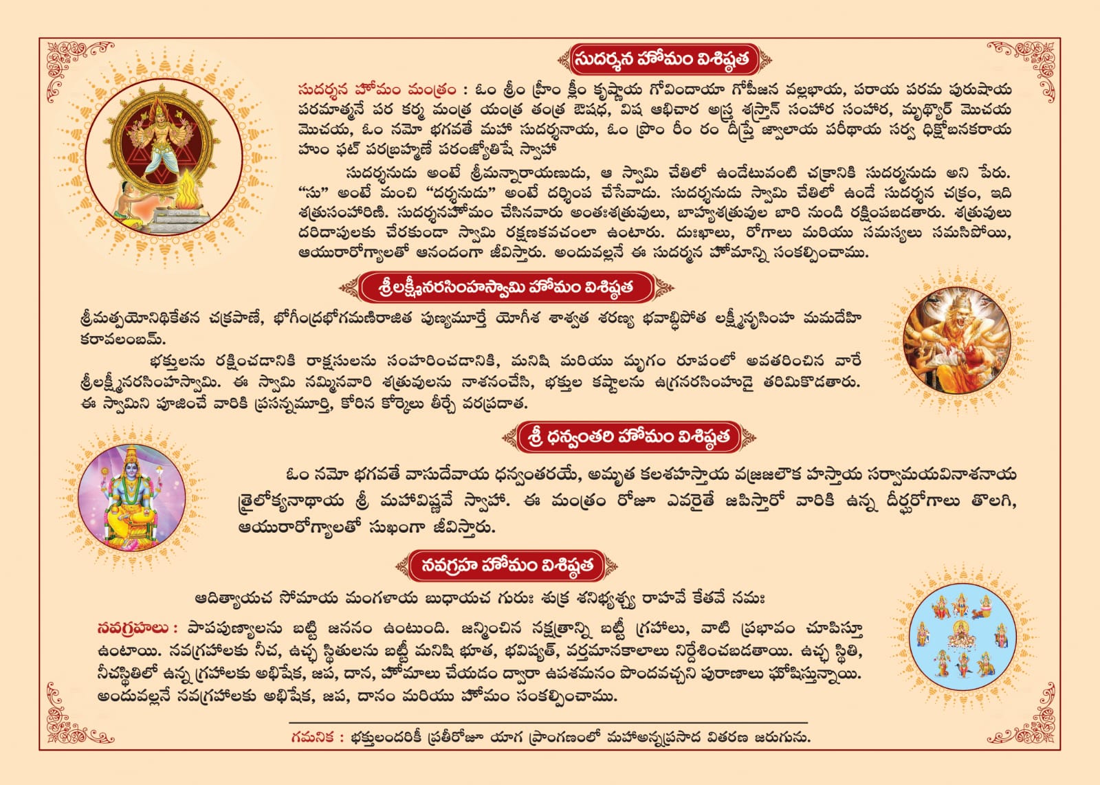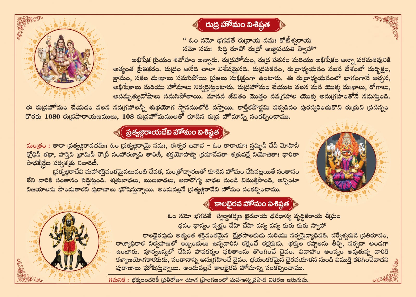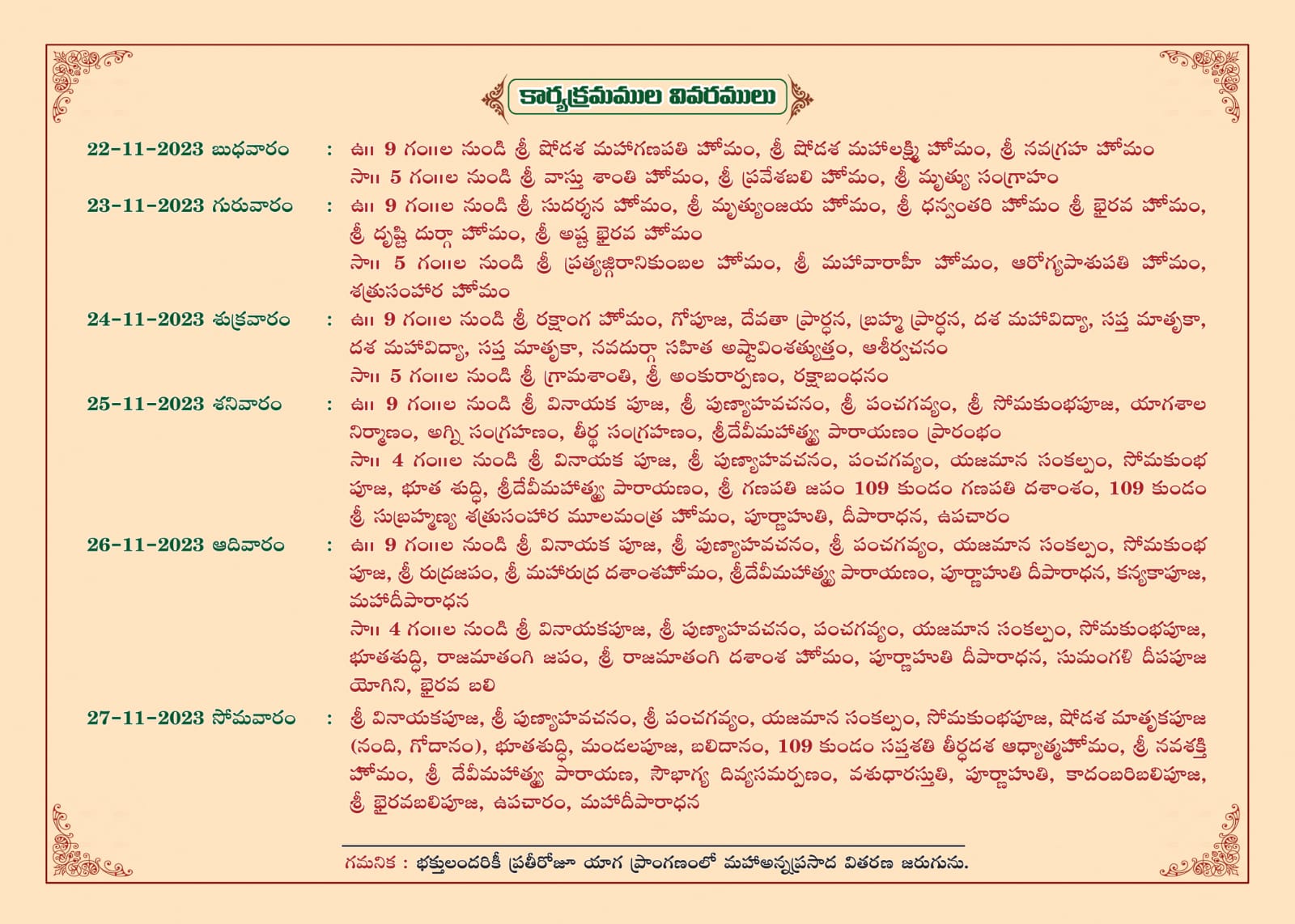 శ్రీ శతకుండాత్మక మహారుద్ర శత సహస్ర మహాచండీ సహిత శ్రీ రాజశ్యామల మహాయాగము మరియు నవకుండాత్మక, షోడశ గణపతి, నవగ్రహ, సుదర్శన, అష్టలక్ష్మి, భైరవ ఆరోగ్య పాశుపతి, శత్రుసంహార, దశమహావిద్యా, సప్తమాతృక, నవదుర్గా మొదలగు పరివార దేవతా హోమములు మరియు సహస్ర కన్యకాపూజ, సహస్ర సుమంగళీపూజ మరియు సహస్ర దీపపూజ సంకల్పించాము.