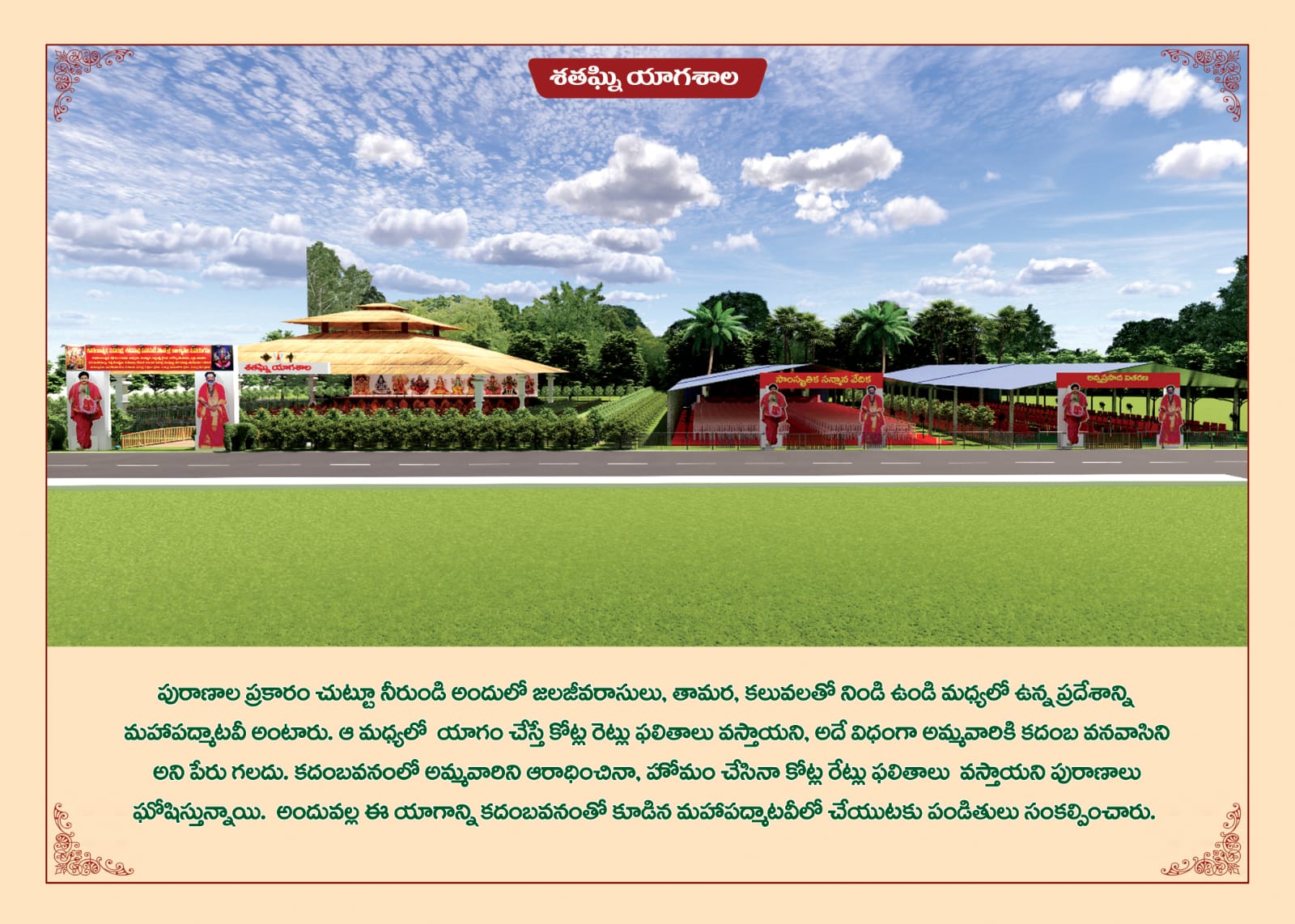 కనీవిని ఎరుగని రీతిలో తొమ్మిది ఎకరాల సువిశాల స్థలంలో మహాయాగశాల నిర్మాణం జరిగింది. తమిళనాడు, కేరళ, కర్ణాటక రాష్ట్రాల నుండి 300 మంది శాక్తేయ, శైవాగమ, వైష్ణవాగమ శాస్త్ర పండితుల వేదమంత్రోచ్ఛారణల నడుమ శాస్త్రోక్తమైన ఉపచారాలతో, ద్వీపరూపంలో నలువైపులా ప్రవాహస్థితిలో ఉన్న నీటిలో జలజీవరాసులు సంచరిస్తుండగా, తామర, కలువ పుష్ప సహితమై ఓం శక్తి రూపిత్రై నమః అని నిత్యం పూజింపబడే అత్యంత సౌకుమార్యమైన కదంబ పుష్పవృక్షాల మధ్య యాగశాలలో సాక్షాత్తు అమ్మవారే వచ్చి ఆసీనులై యాగాన్ని దగ్గర ఉండి జరిపించుకుంటున్నట్లుగా కదంబ పుష్ప వృక్షవనంలో క్రతునిర్వహణ చేయుటకు బృహత్ సంకల్పం.