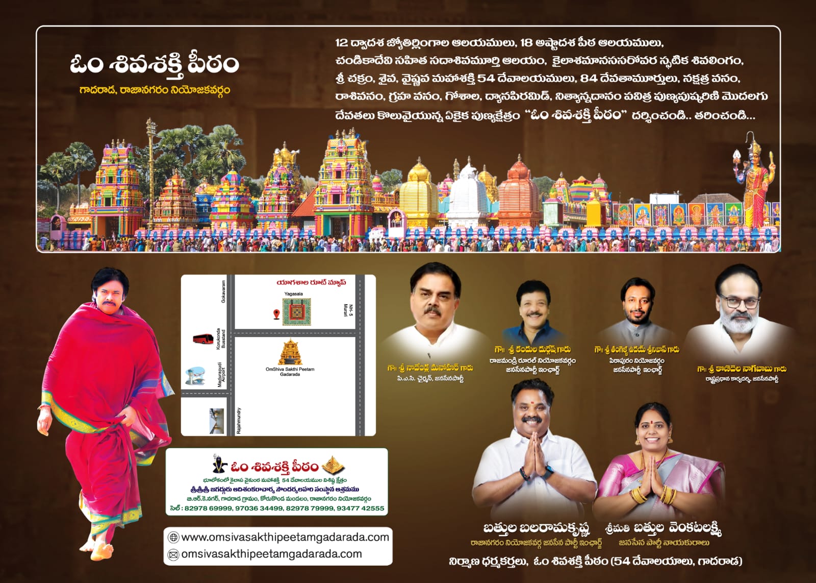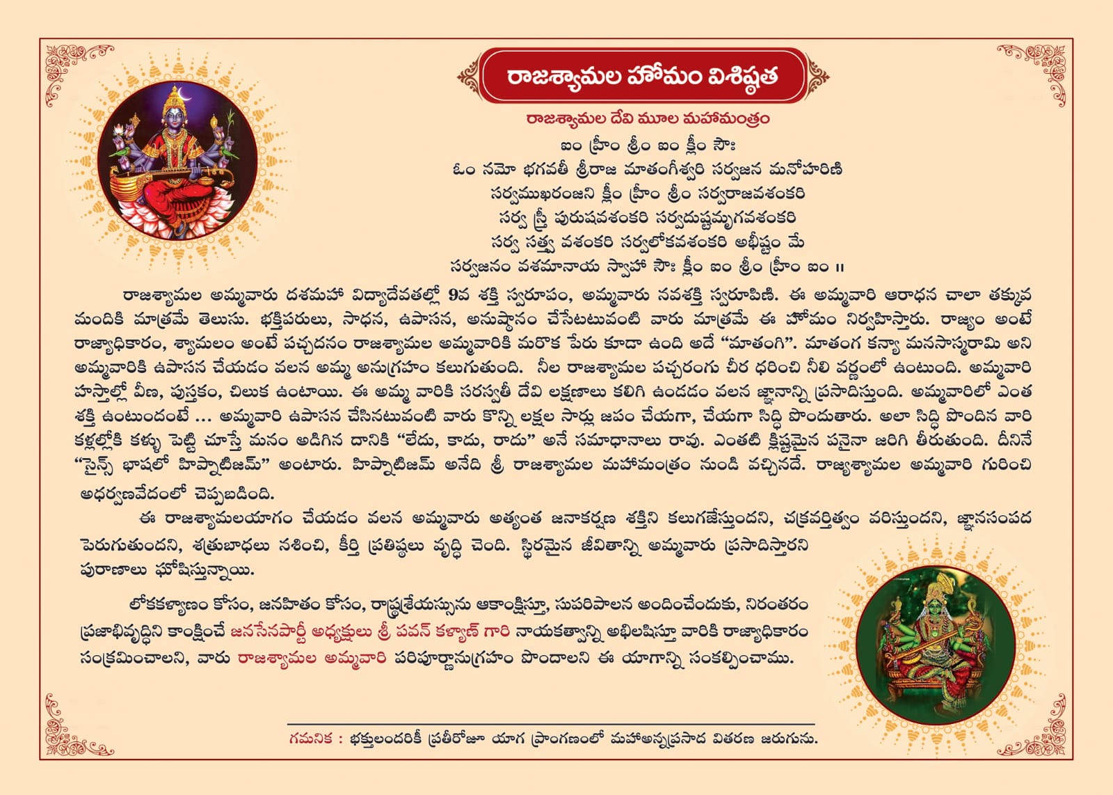 రాజానగరం నియోజకవర్గ జనసేన పార్టీ ఇంఛార్జ్ శ్రీ బత్తుల బలరామకృష్ణ గారు, వారి సతీమణి శ్రీమతి బత్తుల వెంకటలక్ష్మీ గారు దంపతుల ఆధ్వర్యంలో... విశ్వశాంతి, లోక కళ్యాణం, ధర్మ పరిరక్షణ కొరకు, అతివృష్టి, అనావృష్టి, ప్రజాకంటక పాలన నివారణ కొరకు జనసేన పార్టీ అధ్యక్షులు శ్రీ పవన్ కళ్యాణ్ గారికి విశ్వజనని పరిపూర్ణానుగ్రహ ప్రాప్త్యర్ధం, రాజ్యాధికార ప్రాప్తి సిద్ధ్యర్థo, రాష్ట్రాభివ్రుద్ది సహిత ప్రజాస్వామ్యయుత పాలనా సిద్ధ్యర్థo అఖండ భక్తి, జ్ఞానాలతో శ్రీ శతకుండాత్మక, మహారుద్ర, శతసహస్ర మహాచండీ సహిత శ్రీరాజ శ్యామలయాగం కార్తీక మాసం పర్వదినాలను పురస్కరించుకుని ది. 22-11-2023 బుధవారం నుండి ది. 27-11-2023 కార్తీక పౌర్ణమి సోమవారం వరకూ, ఓం శివశక్తి పీఠం, గాదరాడ గ్రామం, కోరుకొండ మండలం, రాజానగరం నియోజకవర్గo, తూర్పు గోదావరిజిల్లాలో చేయ సంకల్పించడమైనది.